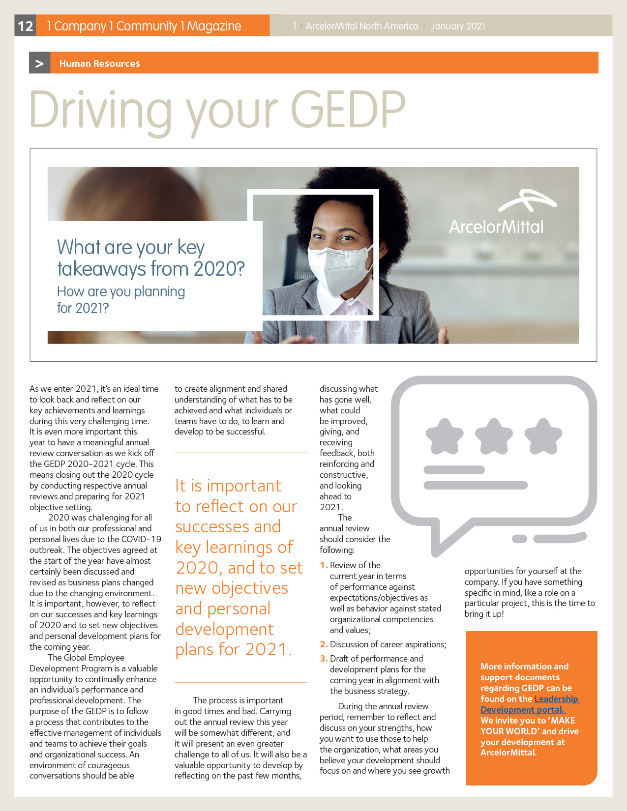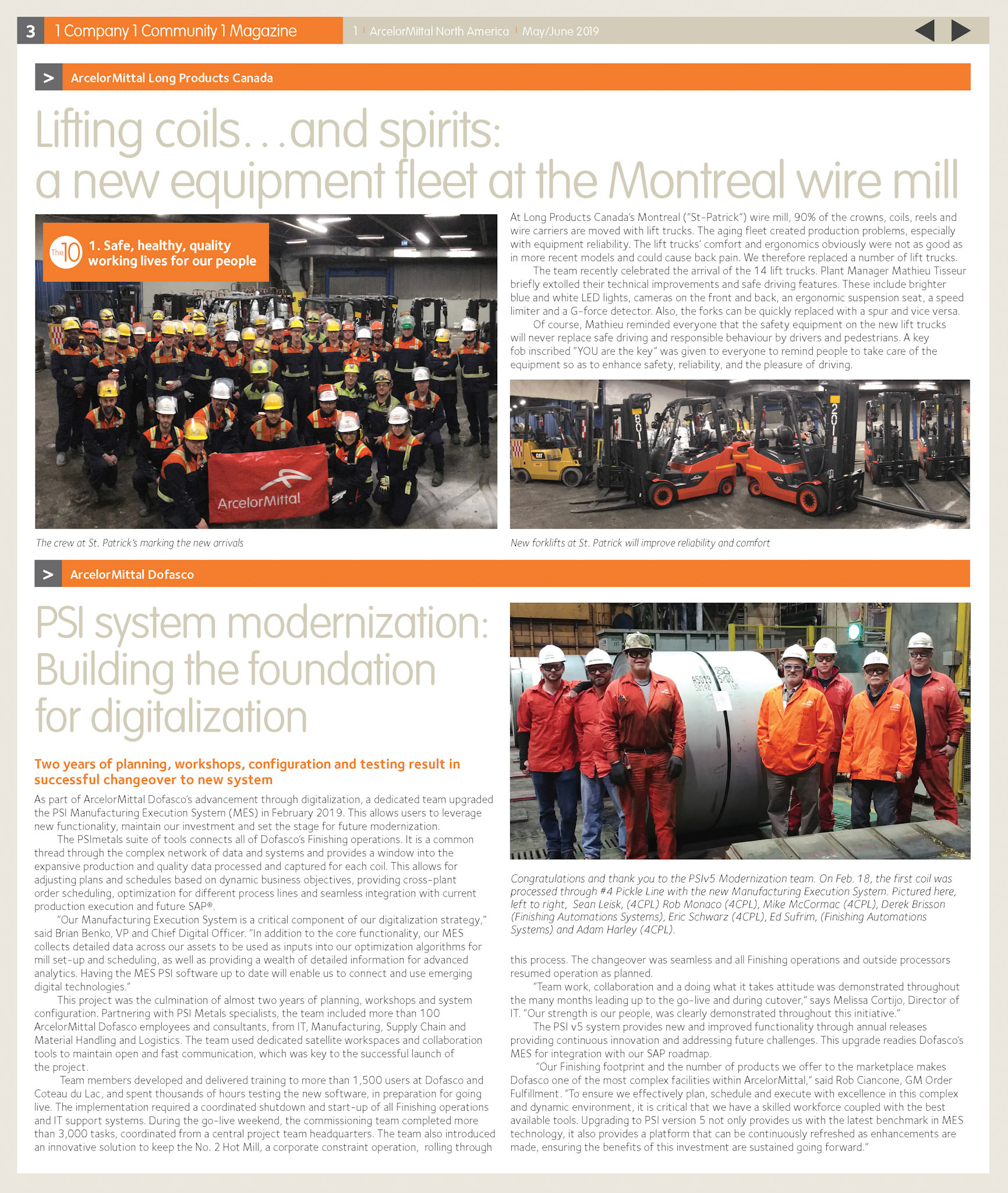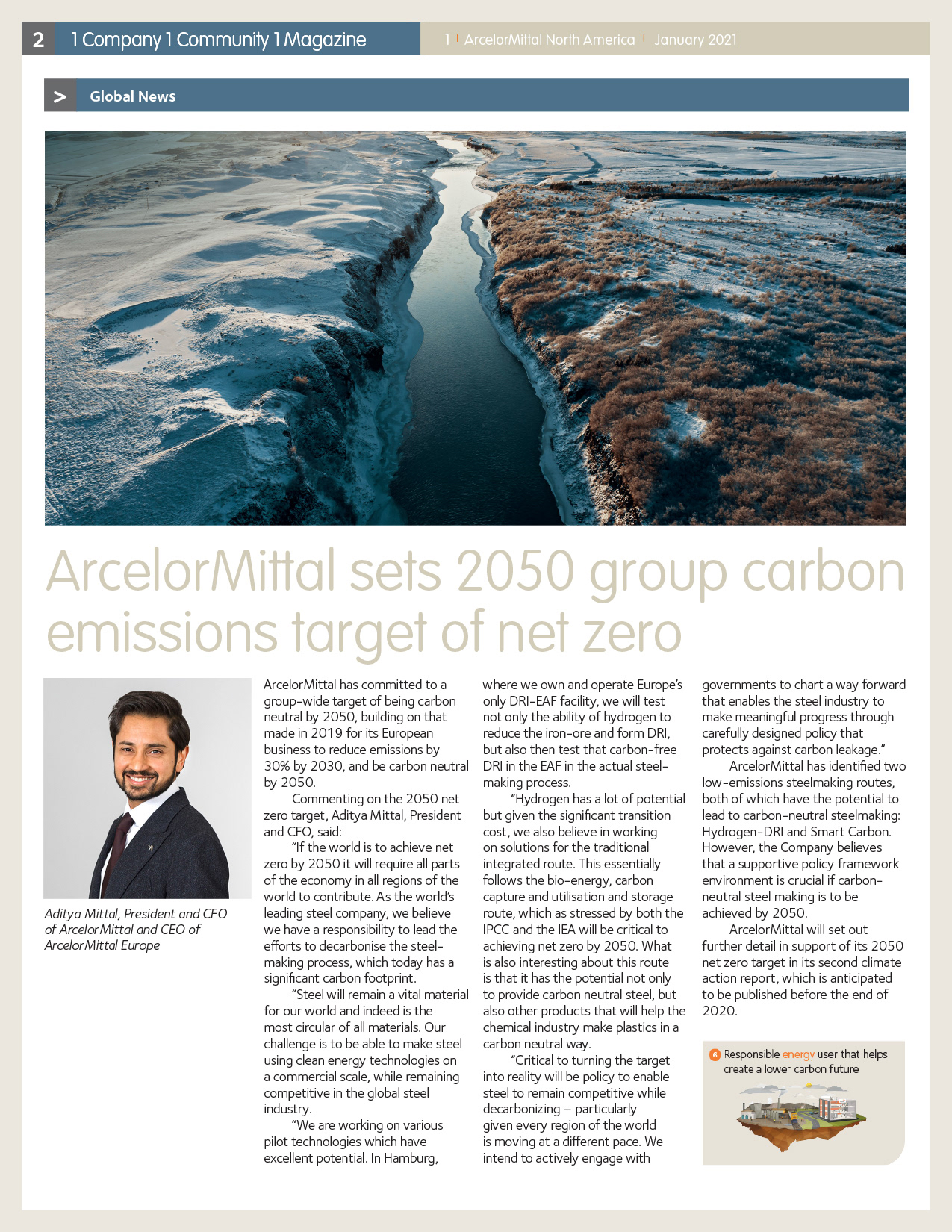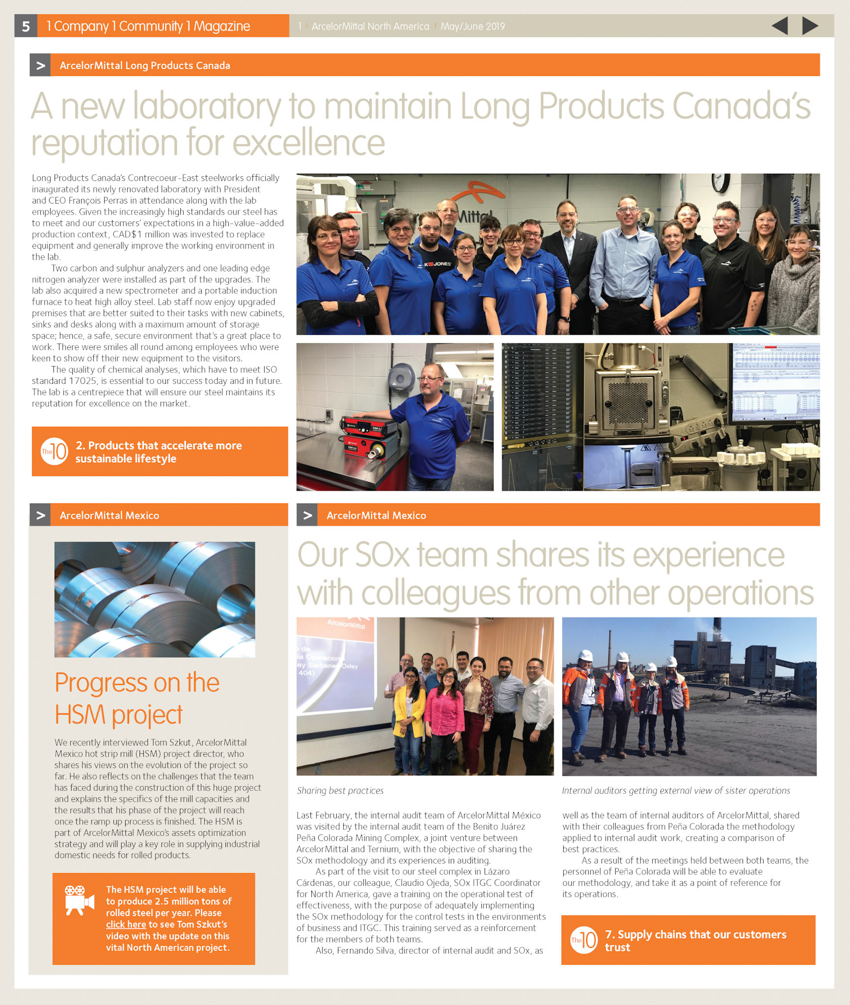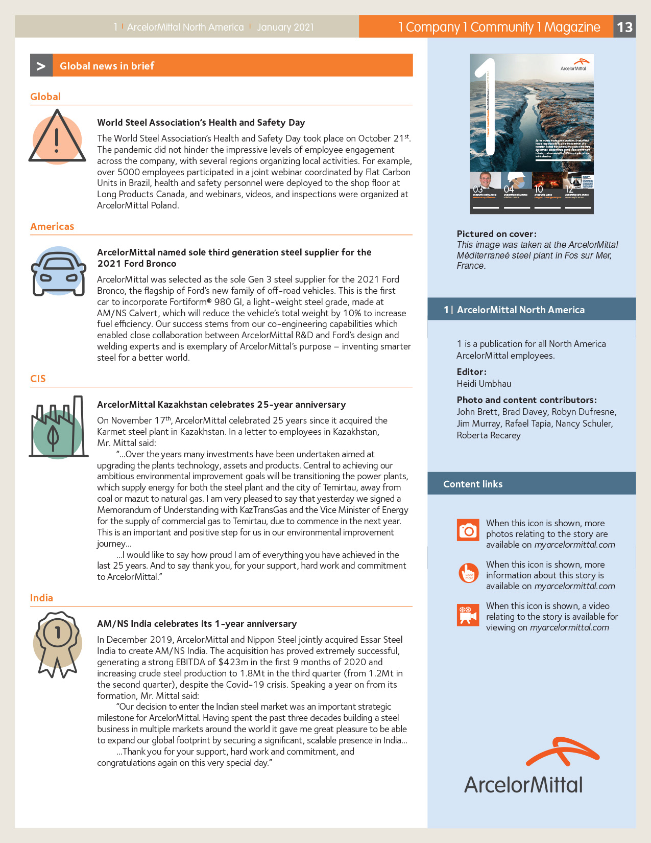 ArcelorMittal quarterly magazine, published in english, french and spanish. I was responsible for design layout and conversion to other languages from 2019-2021. January and May 2021 issues shown below.